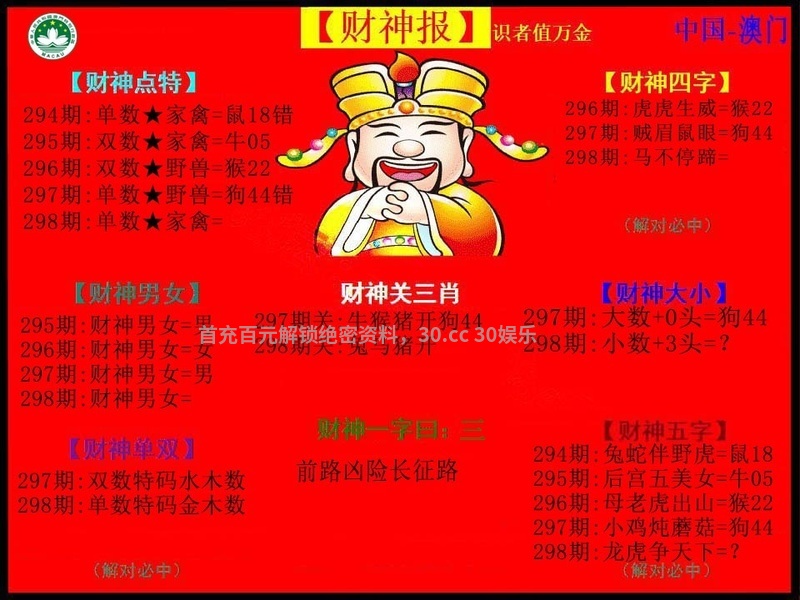 | 298期:【前后四肖】开:羊23错 前【兔蛇鼠虎】后【猴马猪鸡】 |